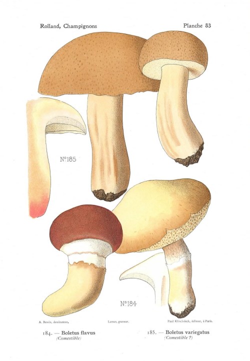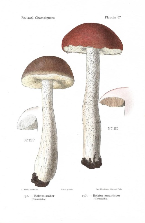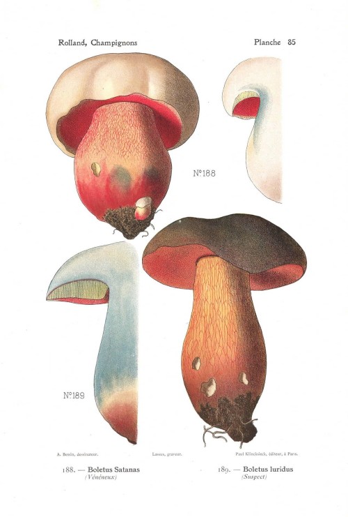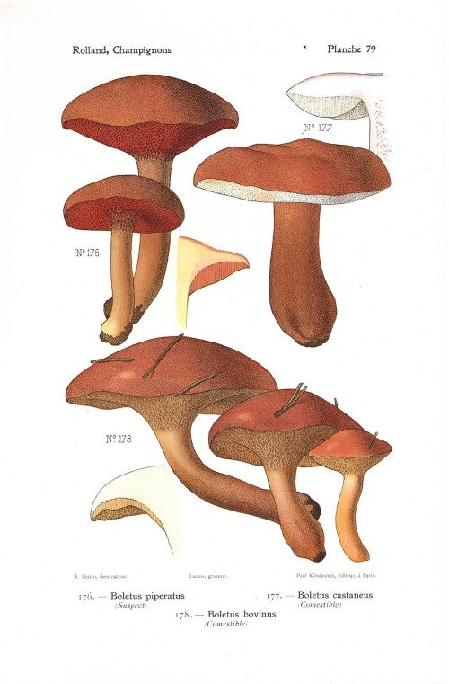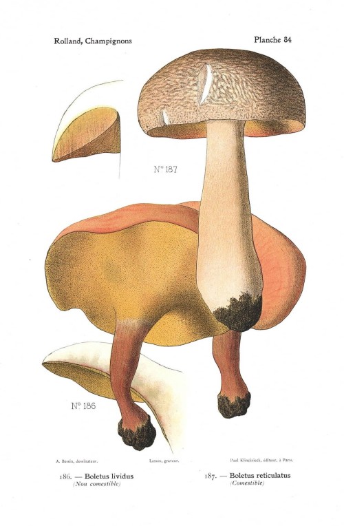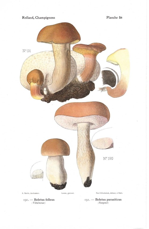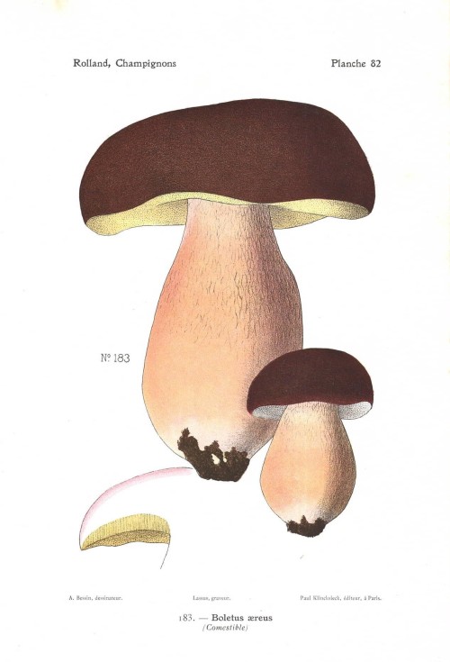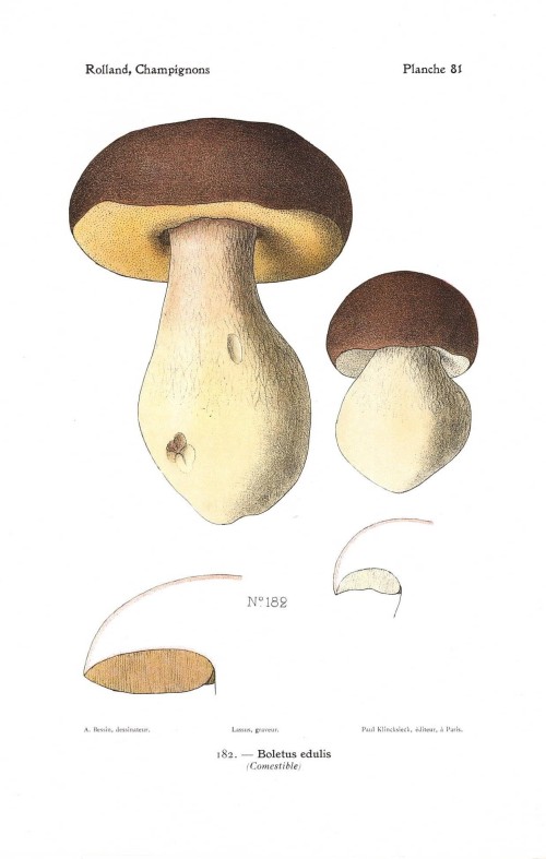 Stampa antica con funghi della specie indicata nel titolo, Boletus edulis, accanto al quale vi è anche l'indicazione se si tratta di fungo commestibile, velenoso o sospetto. |