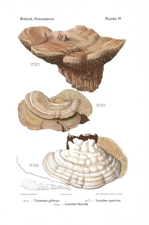 Stampa antica con funghi della specie indicata nel titolo, Trametes gibbosa Lenzites quercina Lenzites flaccida.