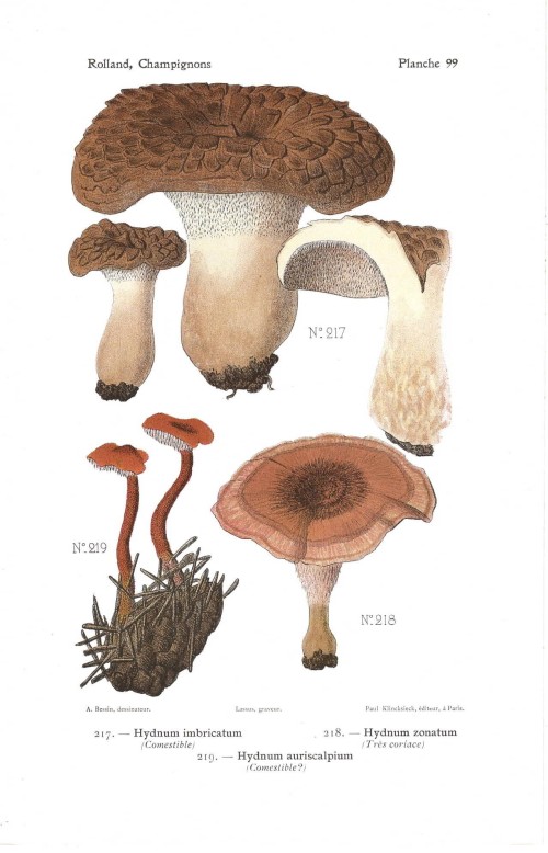 Stampa antica con funghi della specie indicata nel titolo, Hydnum imbricatum Hydnum zonatum Hydnum auriscalpium, accanto al quale vi è anche l'indicazione se si tratta di fungo commestibile, velenoso o sospetto.