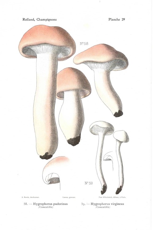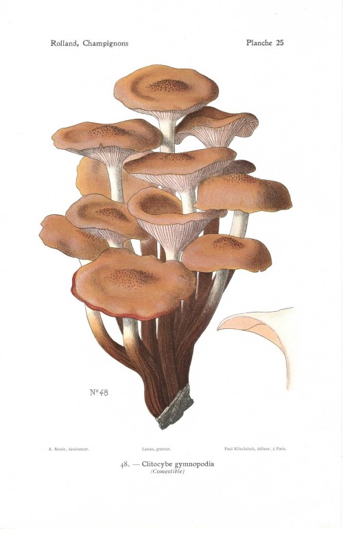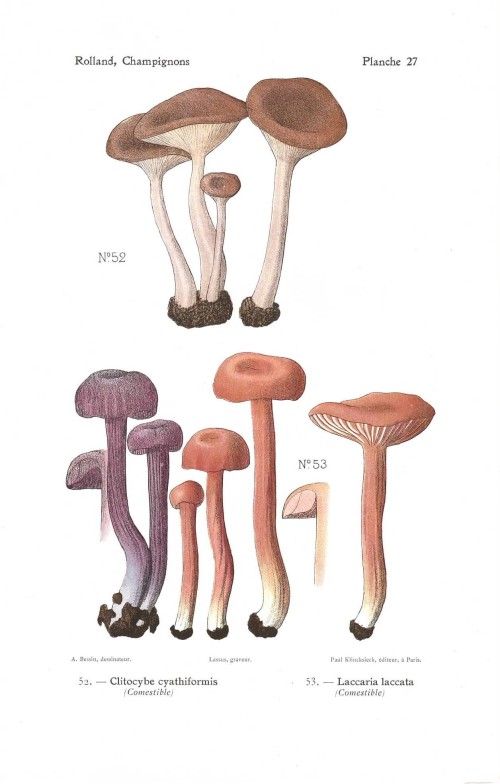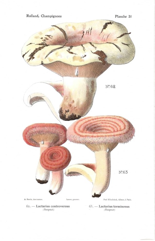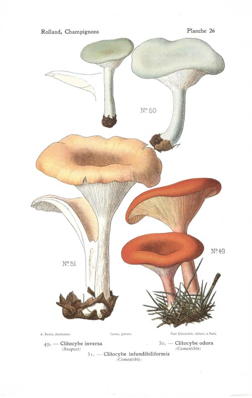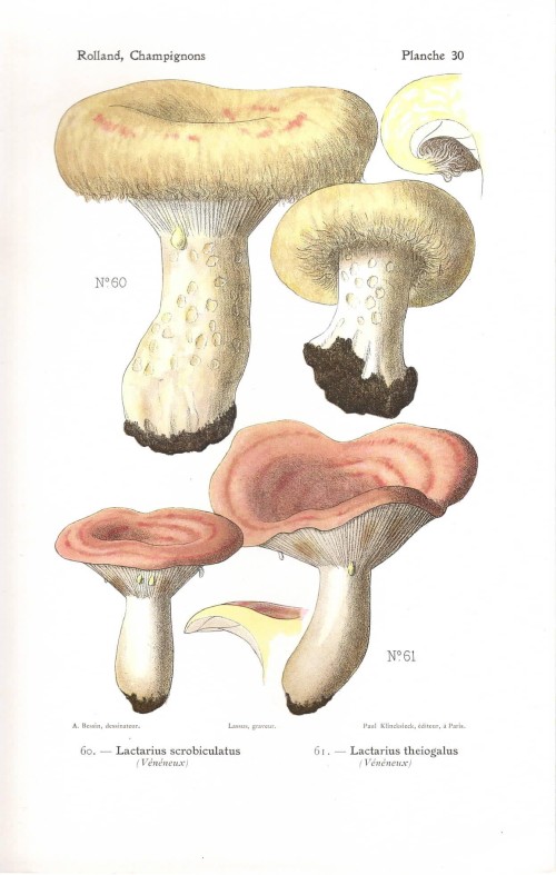 Stampa antica con funghi della specie indicata nel titolo, Amanita phalloides, Amanita verna, accanto al quale vi è anche l'indicazione se si tratta di fungo commestibile, velenoso o sospetto. |