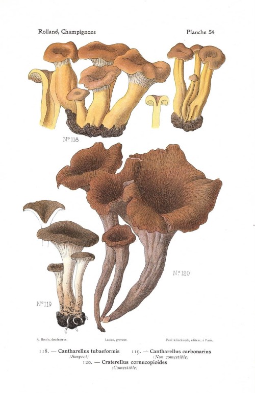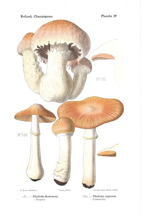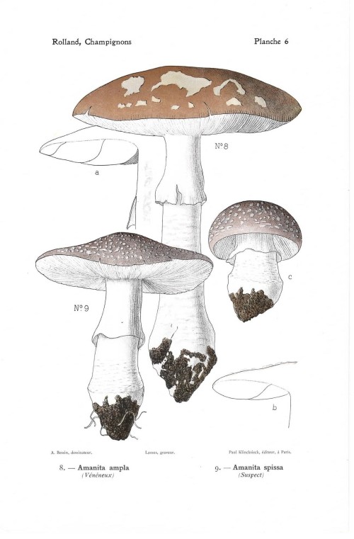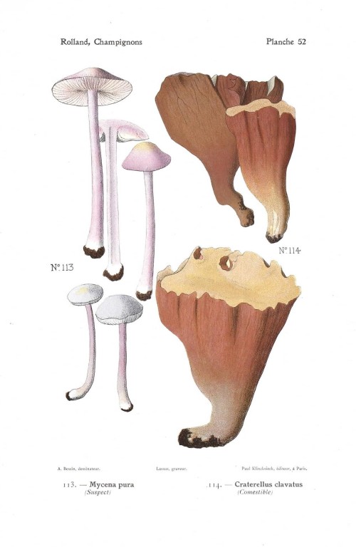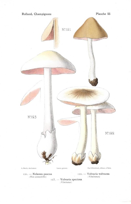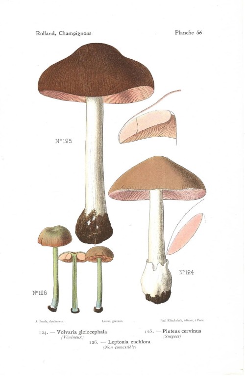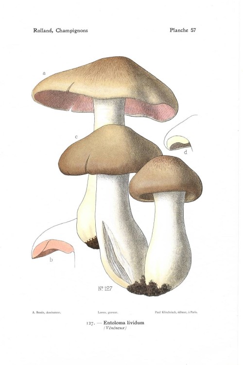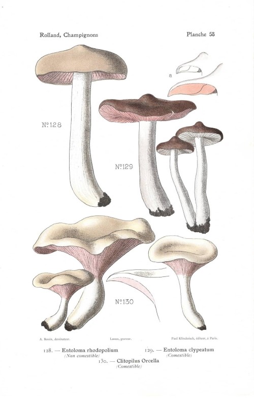 Stampa antica con funghi della specie indicata nel titolo, Entoloma lividum, accanto al quale vi è anche l'indicazione se si tratta di fungo commestibile, velenoso o sospetto. |