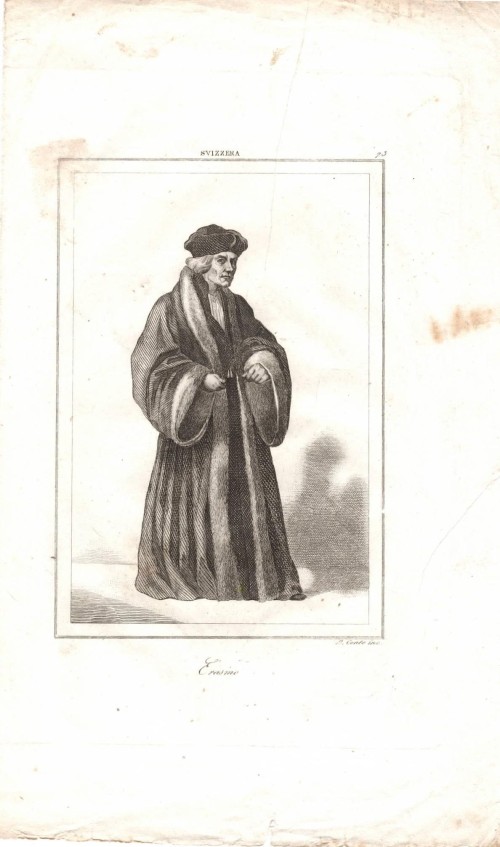 Stampa antica con ritratto di Erasmo da Rotterdam (Rotterdam, 27 o 28 ottobre 1466 o 1469 – Basilea, 12 luglio 1536) presbitero, teologo, umanista, filosofo e saggista olandese. |