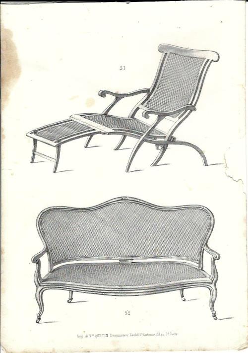 Stampa antica con mobili in bambù, un tavolino ottagonale, un comodino ed un mobiletto da toilette. |