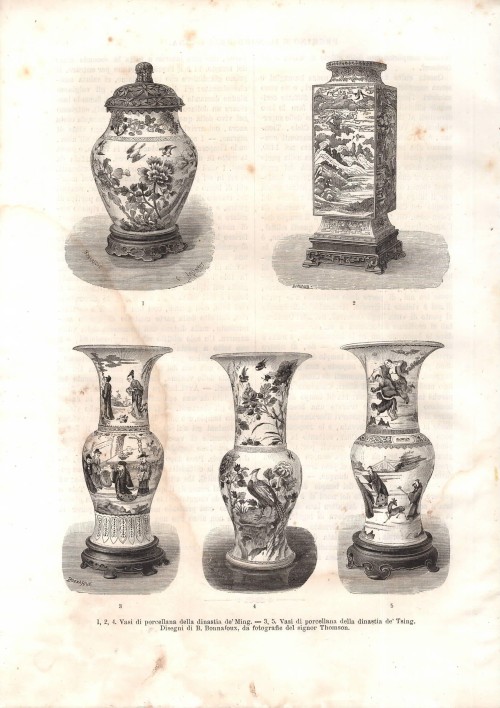 Bella coppia di stampe antiche con decorazioni, edifici e suppellettili della civiltà assiro-babilonese. Ciascuna delle due stampe presenta immagini su entrambi i lati del foglio. |