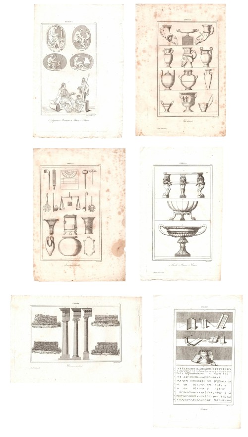 Stampa antica con numerosi oggetti in ceramica di diverse epoche e paesi, vasi, piatti, scodelle, teiere, boccali, statuette. La stampa è stata pubblicata durante la seconda guerra mondiale e, a seguito delle indicazioni governative per il risparmio della carta, le immagini sono state stampate su entrambi i lati del foglio. |