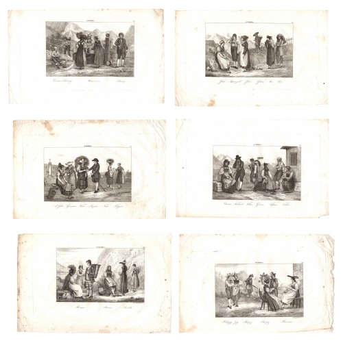 Serie di 6 stampe antiche tratte da disegni di Theodore Valerio con uomini e donne dei Popoli Romani, comunemente chiamati Zingari o Gitani, residenti nella regione storica della Slavonia, nei Balcani fra Croazia e Serbia. |