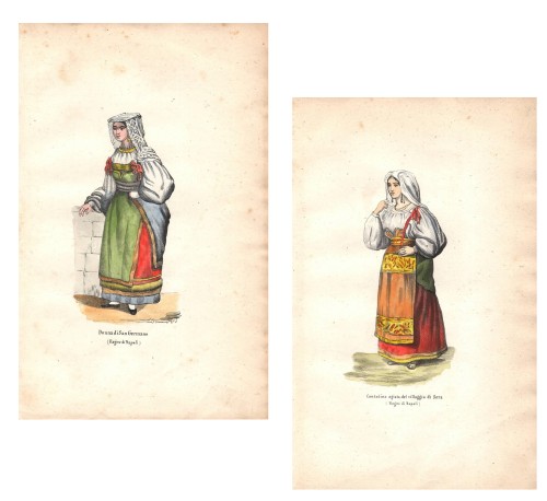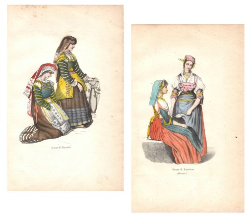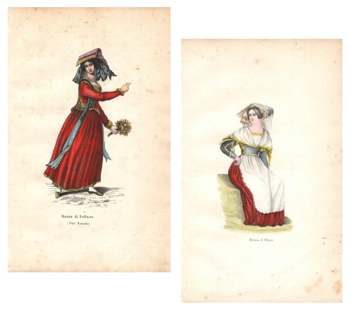 Serie di 6 stampe antiche tratte da disegni di Theodore Valerio con uomini e donne dei Popoli Romani, comunemente chiamati Zingari o Gitani, residenti nella regione storica della Slavonia, nei Balcani fra Croazia e Serbia. |