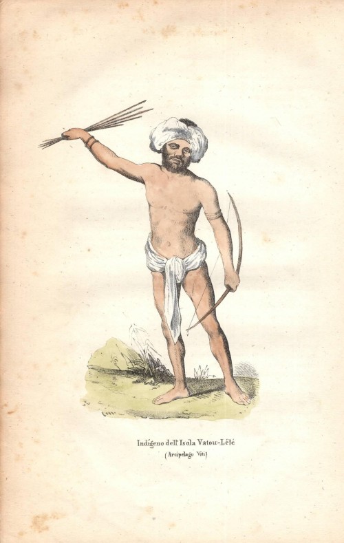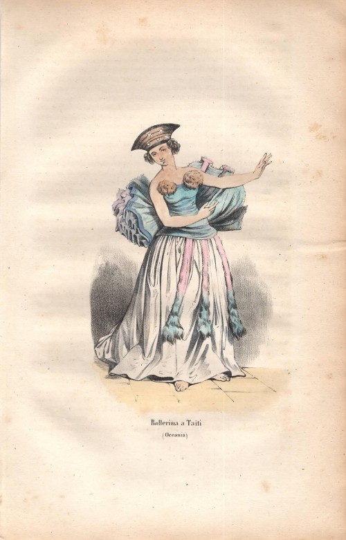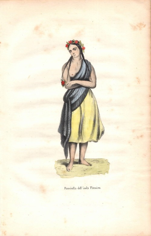 Stampa antica con una giovane ragazza dell'isola Pitcairn, territorio britannico nell' oceano pacifico. È su questo lembo di terra, posto 2200 km a est di Tahiti, che i famosi ammutinati del Bounty si stabilirono nel 1790. |
