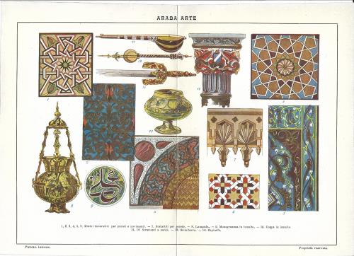 Bella stampa antica con numerosi elementi decorativi in stile arabo: decorazioni di pareti e capitelli, lampada, strumento musicale a corda, scimitarra. |