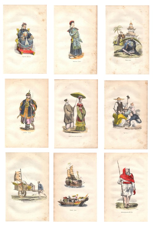 Cina - Imperatore, Mandarino, Bonzi, Soldato e altre figure, Giunche - Serie di 9 stampe antiche |