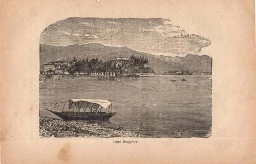 Stampa antica con veduta della baia di Pallanza, sul lago Maggiore, animata da numerose figure e imbarcazioni, fra le quali un grande battello a vapore. |