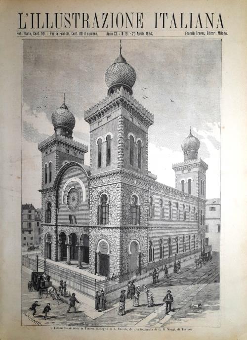 Stampa antica con veduta del tempio ebraico di Torino. L'immagine è animata da numerosi personaggi ed è stata realizzata in occasione della inaugurazione dell'edificio.