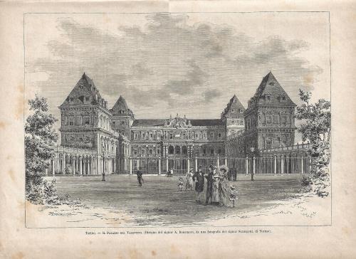 Stampa antica con veduta del Palazzo del Valentino nel Parco del Valentino di Torino, oggi sede della facoltà di Architettura. L'immagine è animata dalla presenza di numerose figure. |