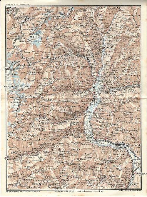 Stampa antica con veduta panoramica di Feriolo, frazione del comune di Baveno sul lago Maggiore, nella provincia del Verbano-Cusio-Ossola. |
