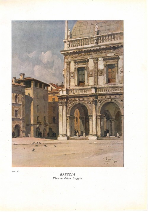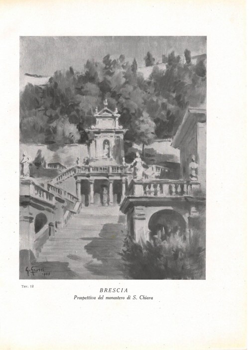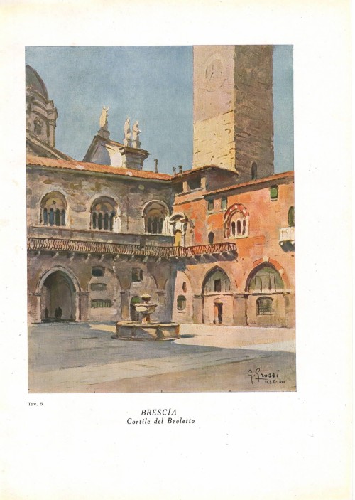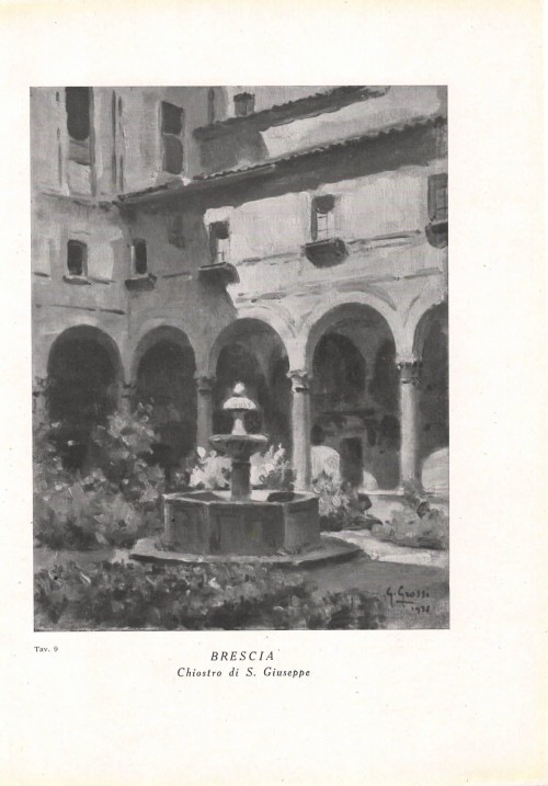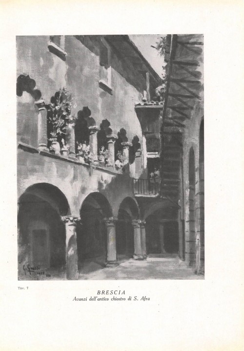 Stampa antica con scorcio del chiostro dorico della Chiesa di San Pietro in Oliveto, più nota come San Pietro in Castello, a Brescia, con al centro il pozzo attribuito al Sansovino. |