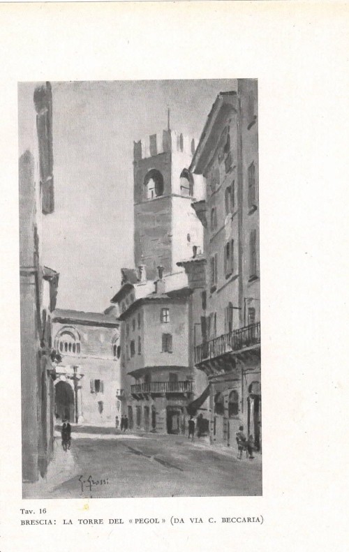 Stampa antica con scorcio di Gavardo, in Valle Sabbia in provincia di Brescia, con alcune case affacciate sul fiume. |