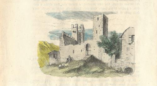 Stampa antica con veduta di Argegno, sulla sponda occidentale del lago di Como. Al centro dell'abitato si erge la torre detta dei Viscardi, nobile famiglia del tempo, crollata nel 1876. |