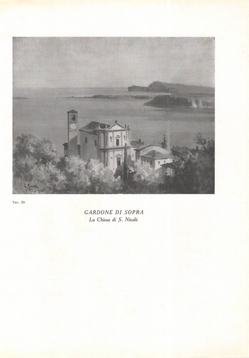 Stampa antica con veduta della chiesa di San Nicolò a Gardone Riviera sul lago di Garda in provincia di Brescia.