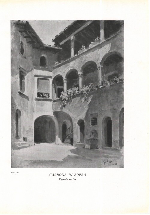 Stampa antica con veduta di un vecchio cortile con logge a Gardone Riviera sul lago di Garda in provincia di Brescia.
