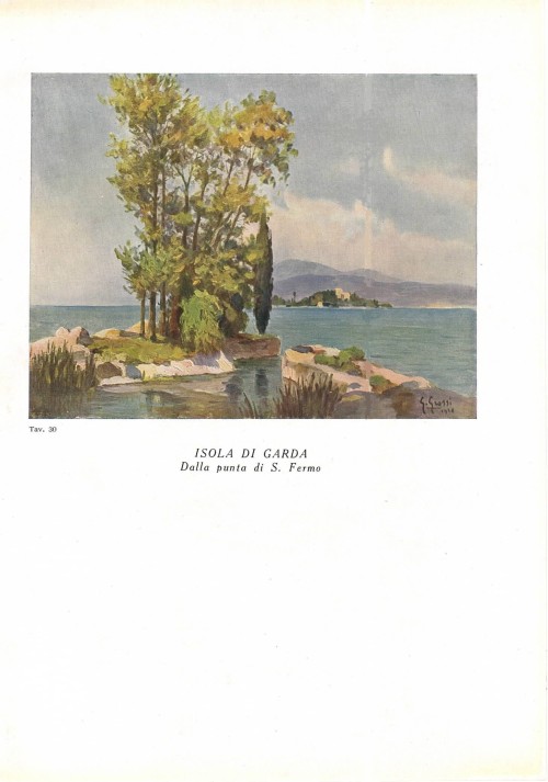Stampa antica con veduta panoramica dell' Isola di Garda, sul lago di Garda, vista da Capo San Fermo, fra il golfo di Salò e la baia dello smeraldo. L'isola appartiene amministrativamente al comune di San Felice del Benaco.