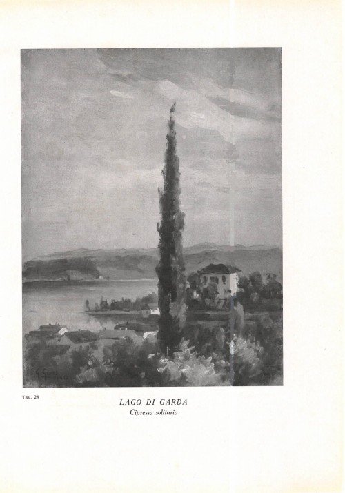 Stampa antica con veduta panoramica del lago di Garda con un alto cipresso in primo piano.