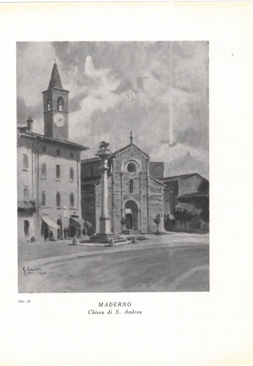 Stampa antica con veduta della Chiesa Monumentale di Sant'Andrea a Maderno, frazione di Toscolano Maderno sul lago di Garda in provincia di Brescia.