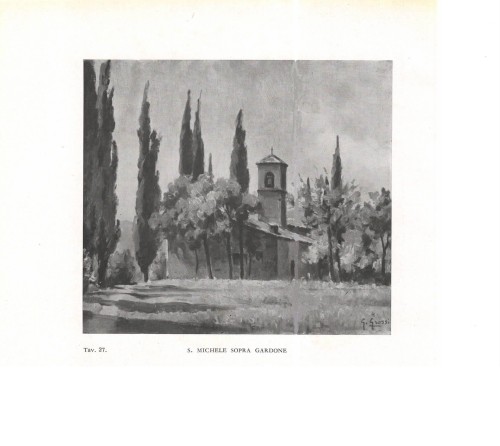 Stampa antica con veduta della chiesa di San Michele nell'omonima frazione di Gardone Riviera sul lago di Garda in provincia di Brescia.