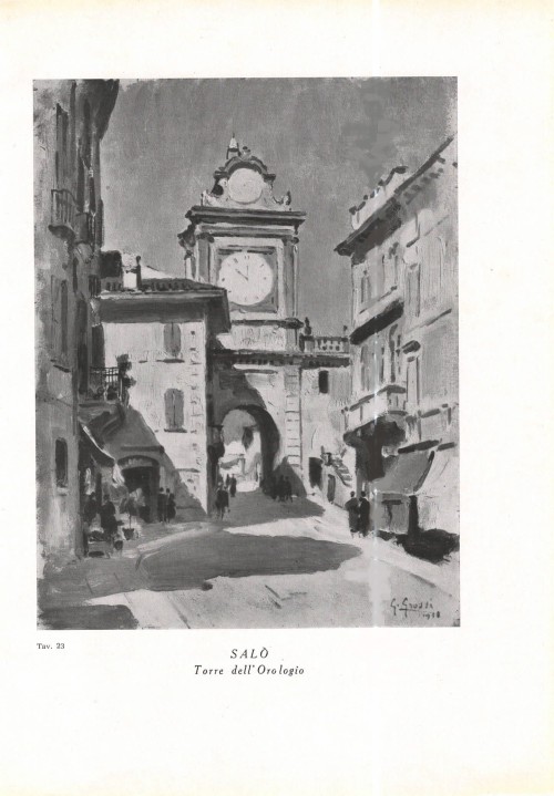 Stampa antica con veduta della Porta dell' Orologio di Salò sul lago di Garda in provincia di Brescia.
