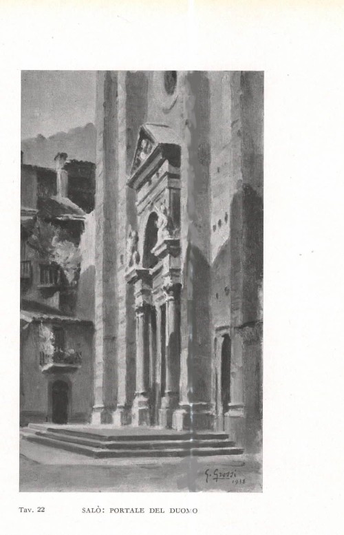 Stampa antica con scorcio del portale del duomo di Salò sul lago di Garda in provincia di Brescia.