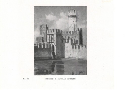 Stampa antica con veduta del castello scaligero di Sirmione sul lago di Garda in provincia di Brescia.