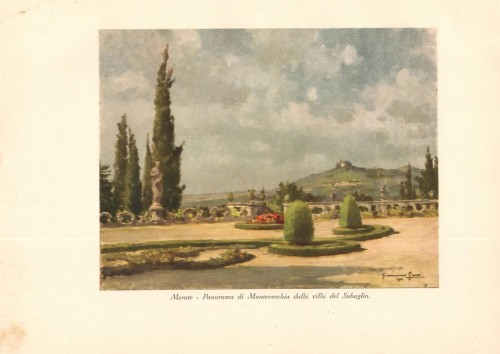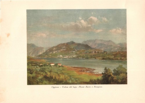 Bella stampa antica con veduta panoramica del lago di Oggiono, in provincia di Lecco, con al centro il monte Barro ed il monte Resegone sullo sfondo. |