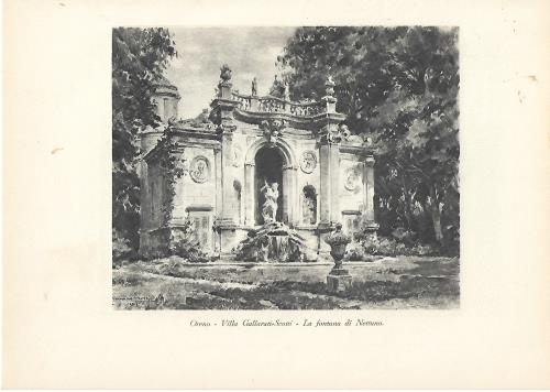 Stampa antica con scorcio dell'ingresso della villa dei primi decenni del Settecento che fu del conte Paolo Andreani, l’estroso personaggio che compì una delle prime ascensioni in mongolfiera partendo dal giardino della sua residenza di campagna, a Moncucco, frazione di Brugherio, oggi in provincia di Monza e Brianza. |