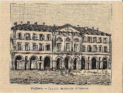 Stampa antica con veduta del Palazzo Comunale di Mortara, in provincia di Pavia, con la piazza antistante animata dalla presenza di numerose figure. |