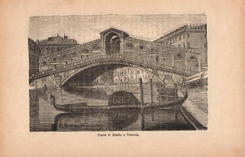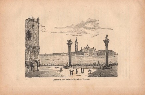 Bella stampa antica con veduta panoramica di Venezia, con l'imbarcadero del Lido in primo piano e la città sullo sfondo. L'immagine è animata dalla presenza di gondole ed altre imbarcazioni. |