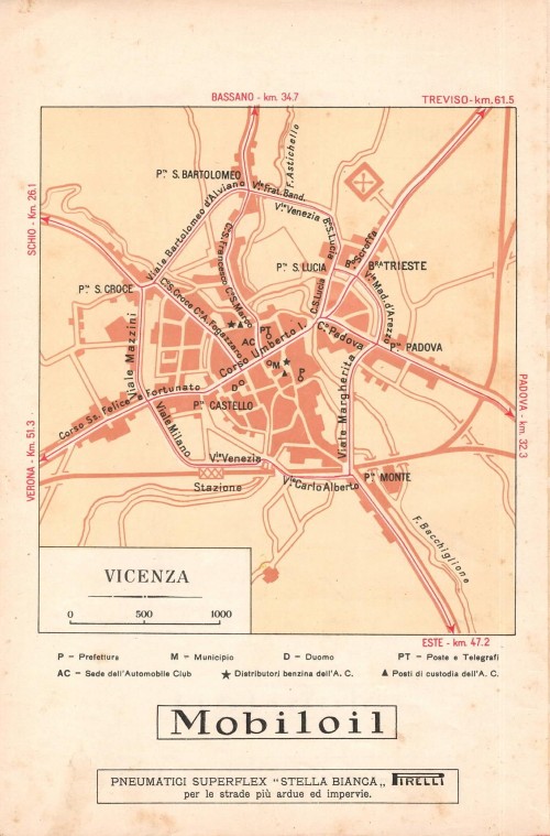 DESCRIPTION Mappa antica schematica della città di Vicenza. Sulla pianta sono evidenziate la Prefettura, il Municipio, il Duomo, le Poste, la sede i distributori di benzina e i posti di custodia dell' Automobile Club d'Italia. In calce al foglio vi sono annunci pubblicitari di Mobiloil e Pirelli.