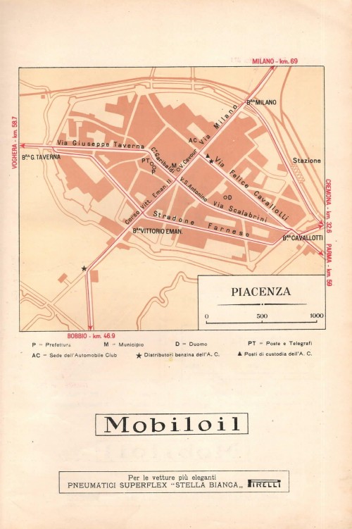 DESCRIPTION Mappa antica schematica della città di Piacenza. Sulla pianta sono evidenziate la Prefettura, il Municipio, il Duomo, le Poste, la sede i distributori di benzina e i posti di custodia dell' Automobile Club d'Italia. In calce al foglio vi sono annunci pubblicitari di Mobiloil e Pirelli.