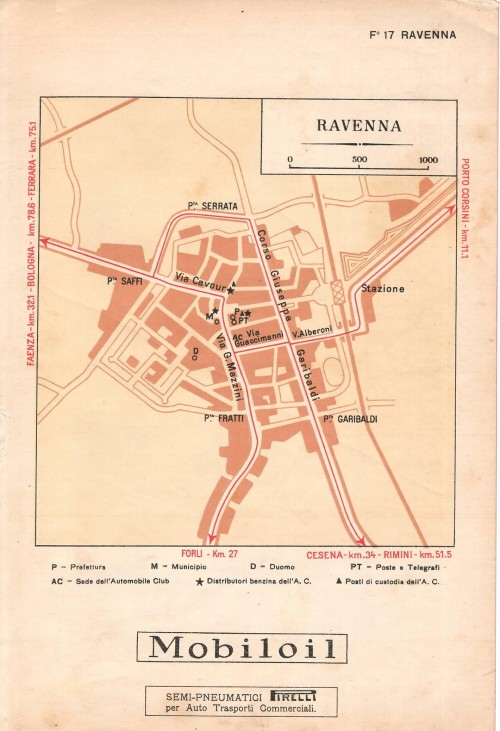 DESCRIPTION Mappa antica schematica della città di Ravenna. Sulla pianta sono evidenziate la Prefettura, il Municipio, il Duomo, le Poste, la sede i distributori di benzina e i posti di custodia dell' Automobile Club d'Italia. In calce al foglio vi sono annunci pubblicitari di Mobiloil e Pirelli.