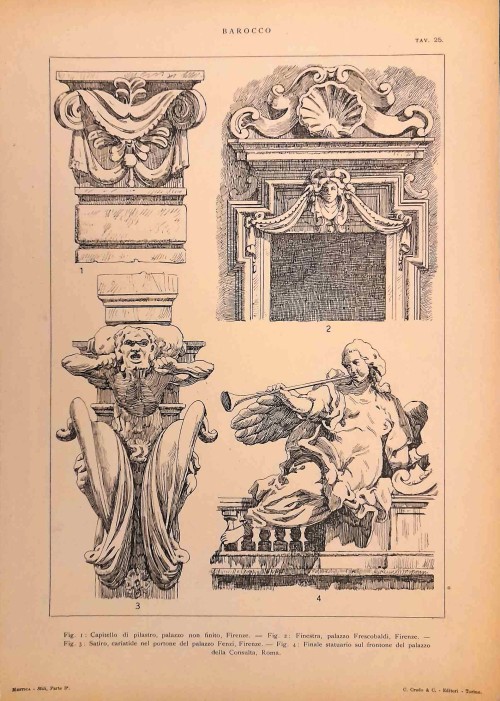 Stampa antica con elementi di architettura, capitelli e decorazioni in stile Rinascimento di alcuni celebri edifici e monumenti: il Marzocco di Firenze, Chiesa di San Francesco a Siena, Chiesa di Santa Croce a Firenze, Palazzo Cuccoli Fiaschi a Firenze. |