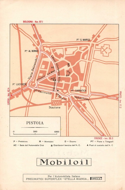 Mappa antica schematica della città di Pistoia. Sulla pianta sono evidenziate la Prefettura, il Municipio, il Duomo, le Poste, la sede i distributori di benzina e i posti di custodia dell' Automobile Club d'Italia. In calce al foglio vi sono annunci pubblicitari di Mobiloil e Pirelli. |