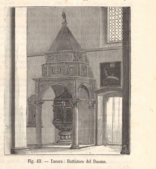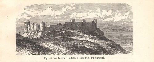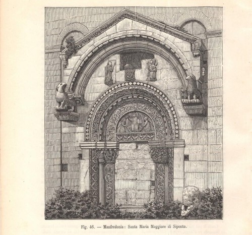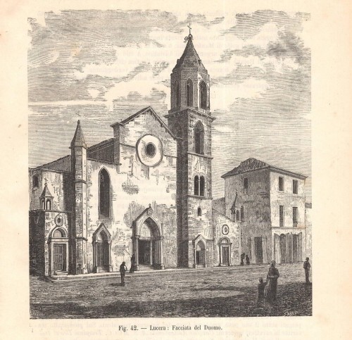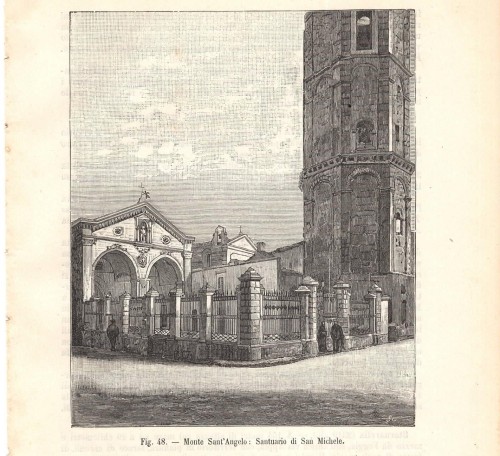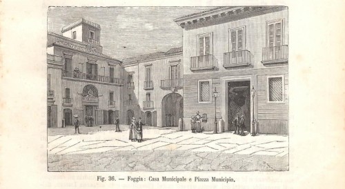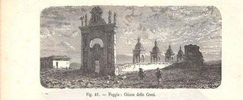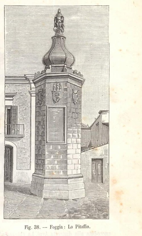 Stampa antica con l'Epitaffio di Foggia, monumento situato al termine di Via Alessandro Manzoni verso Piazza Sant'Eligio. |