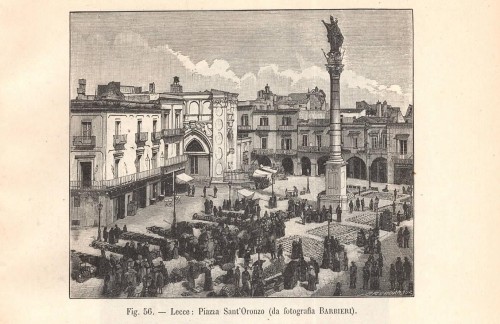 Bella stampa antica con veduta di Soleto in terra d'Otranto, in provincia di Lecce, con al centro l'alto campanile. |