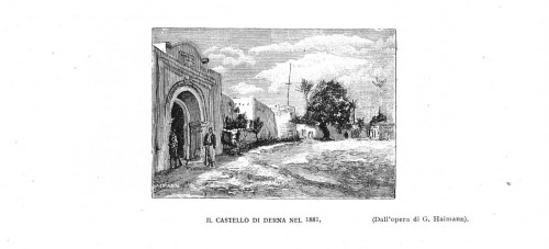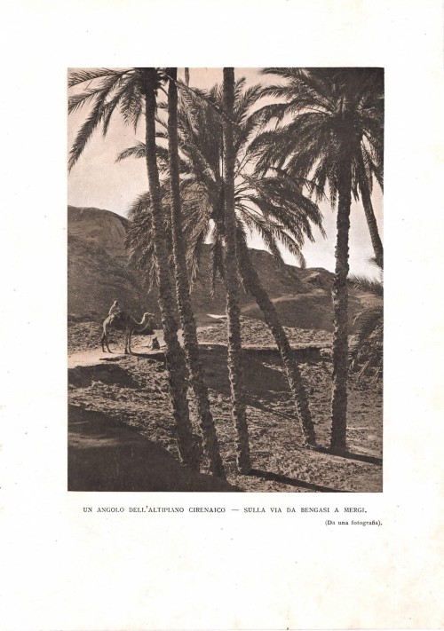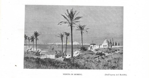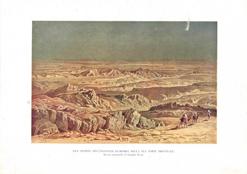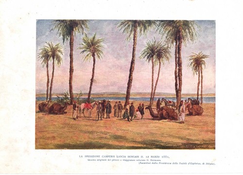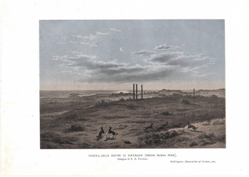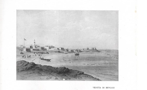 Stampa antica con veduta panoramica del territorio di Bengasi in Cirenaica, all'epoca di questa stampa una delle prime regioni conquistate dall' Italia, assieme alla Tripolitania, nel processo di colonizzazione della Libia. Il dipinto riprodotto in questa stampa è stato realizzato nel 1881 in occasione della partenza della spedizione esplorativa diretta da Manfredo Camperio (1826-1899), patriota, politico e geografo, fondatore e animatore della rivista "L'Esploratore" e della Società d'Esplorazione Commerciale in Africa. |