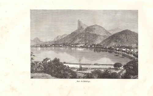 Stampa antica con veduta panoramica del lago George (Lake George), noto anche come Queen of American Lakes (regina dei laghi americani), lago situato alla base del versante sud-est delle montagne Adirondack, nell'area nord-orientale dello stato di New York, negli Stati Uniti d'America. |