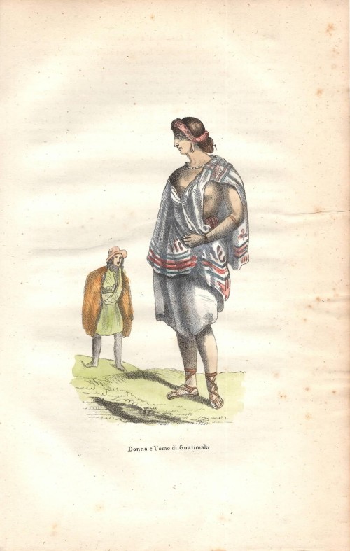 Stampa antica con una giovane donna e un uomo del Guatemala con costumi tradizionali.