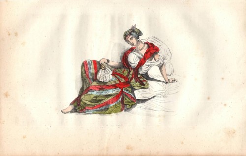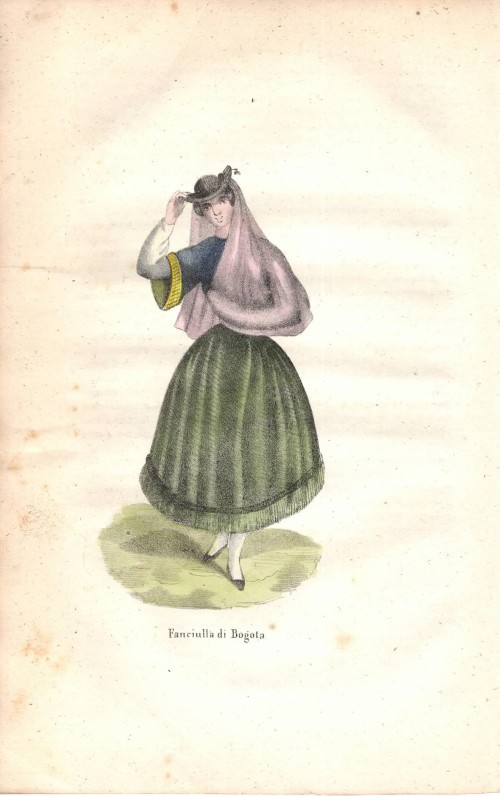 Stampa antica con una giovane donna della Colombia con costume tradizionale.