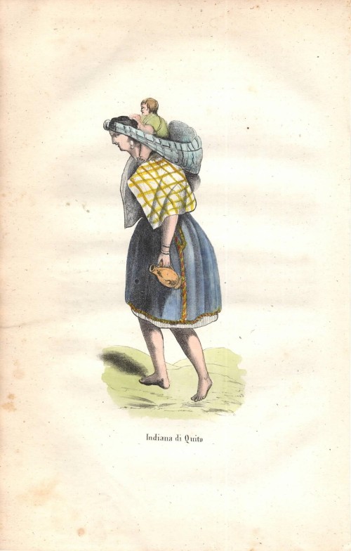 Stampa antica con una giovane donna dell' Ecuador con il suo bambino sulle spalle con costume tradizionale.