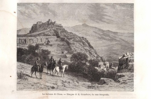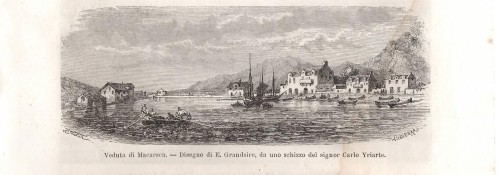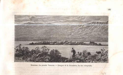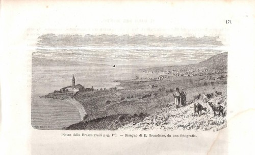 Stampa antica con veduta panoramica di San Pietro di Brazza (Supetar), in passato San Pietro della Brazza, la principale località sull'isola di Brazza, in Dalmazia in Croazia. |