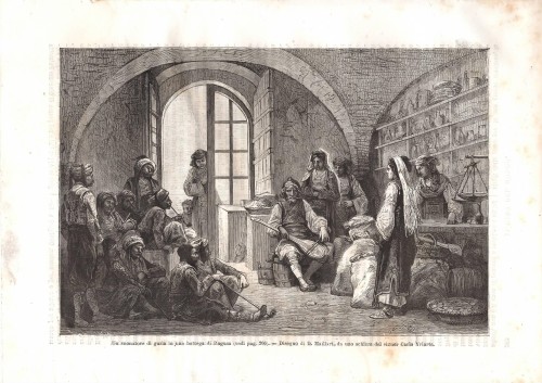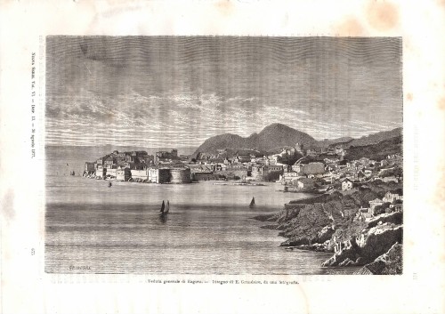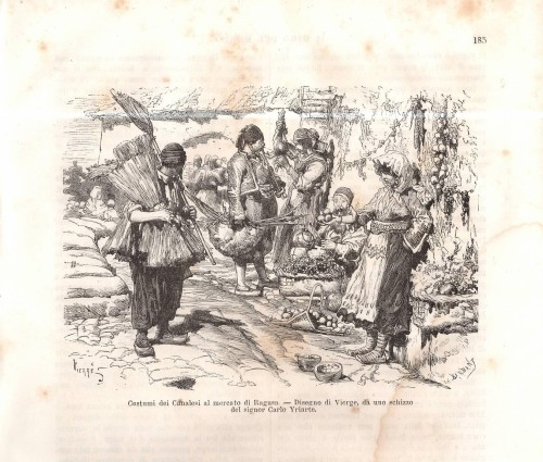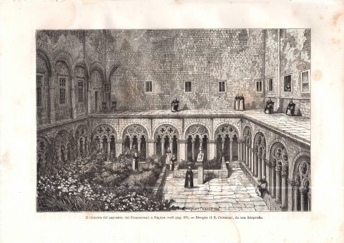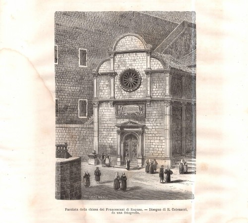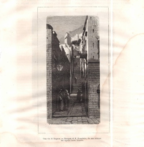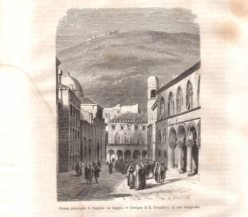 Stampa antica con la piazza principale e la loggia del Palazzo dei Rettori a Dubrovnik (Ragusa) in Dalmazia in Croazia. L'immagine è animata dalla presenza di numerose figure. |