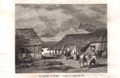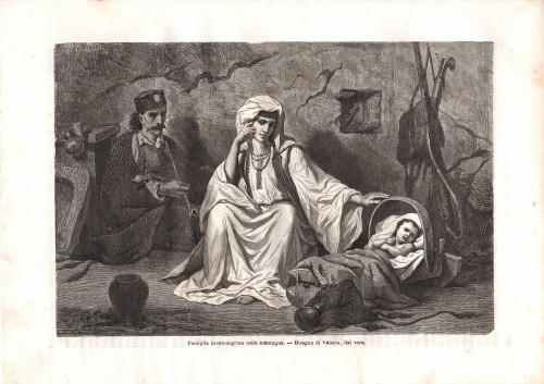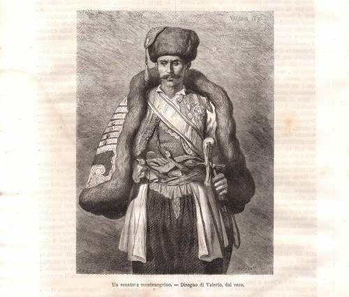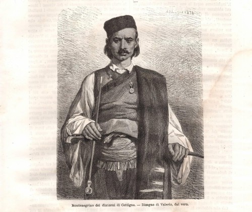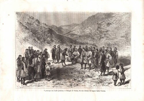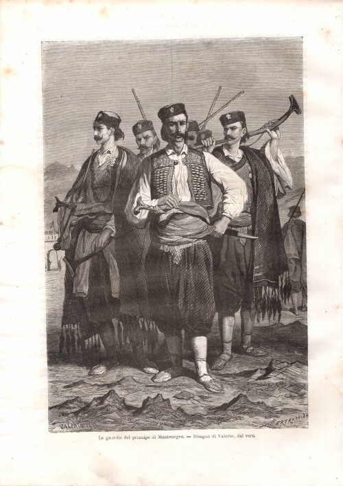 Stampa antica con il principe Nicola I che amministra la giustizia a Cetinje (Cettigne), la capitale storica del Montenegro. L'immagine è animata dalla presenza di numerose figure che assistono al processo all'aperto.