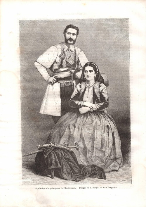 Stampa antica con ritratto del principe Nicola I del Montenegro, primo re e fondatore del regno del Montenegro, assieme alla moglie Milena. Una delle loro figlie, Elena, divenne regina d'Italia avendo sposato Vittorio Emanuele III.